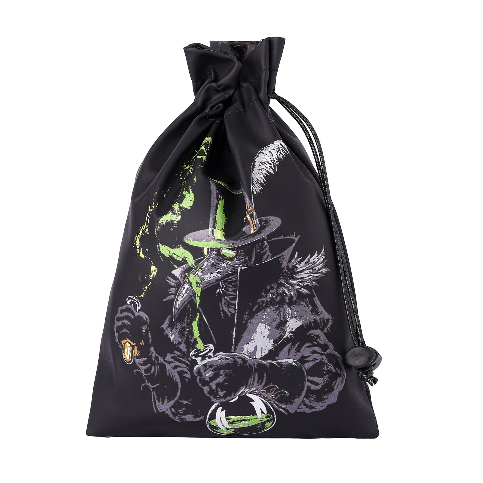 Soft Black leather, with matched satin interior lining, decorated with Fine Arts-Plague doctor. This dice bag will be your next beloved dice accessories!