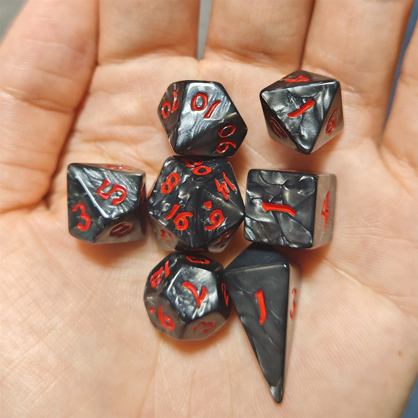 Set of 7 mini polymer dice, same design as the 8-piece version of the same series!