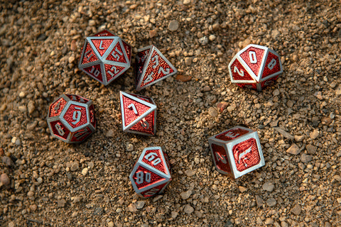 *With confidence flowing from an unknown source, you grab the third box, pour them into your hand, and cast them into the tray. Power washes over you as they all land showing their highest face value. You notice for the first time, these have a tighter scale pattern highlighted by a rich, red enamel and bold runes. Also for the first time, you notice the man get excited as he once again boxes up the relics and places them on top of the last set. Then, without a word, he pushes the last set to you. Reverently, you unbox them , noticing that although they appear similar to the first two sets, they are significantly lighter. Pure silver sings as they clang together in your hand. You realize they are hollow, and the runes exist in the negative space of forged metal sides. Instinct guides you to release the tiny metal cages. A flash and crackle of energy obscures your vision. Slowly, as the world comes back into focus, you see all seven relics have landed to balance impossibly on a corner.*