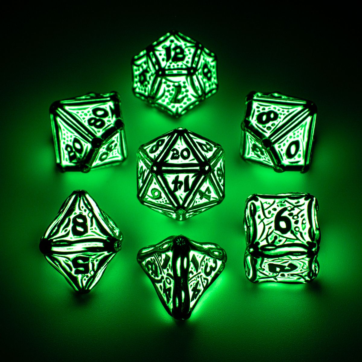 Glow in the Dark Solid Metal Druid Polyhedral Dice Set