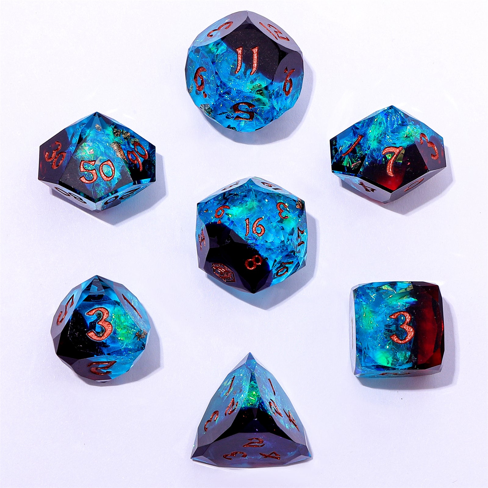 Set of 7 polyhedral resin dice with a luster cut for maximum shine, which shimmers with delicate luster like captured starlight when rolled.