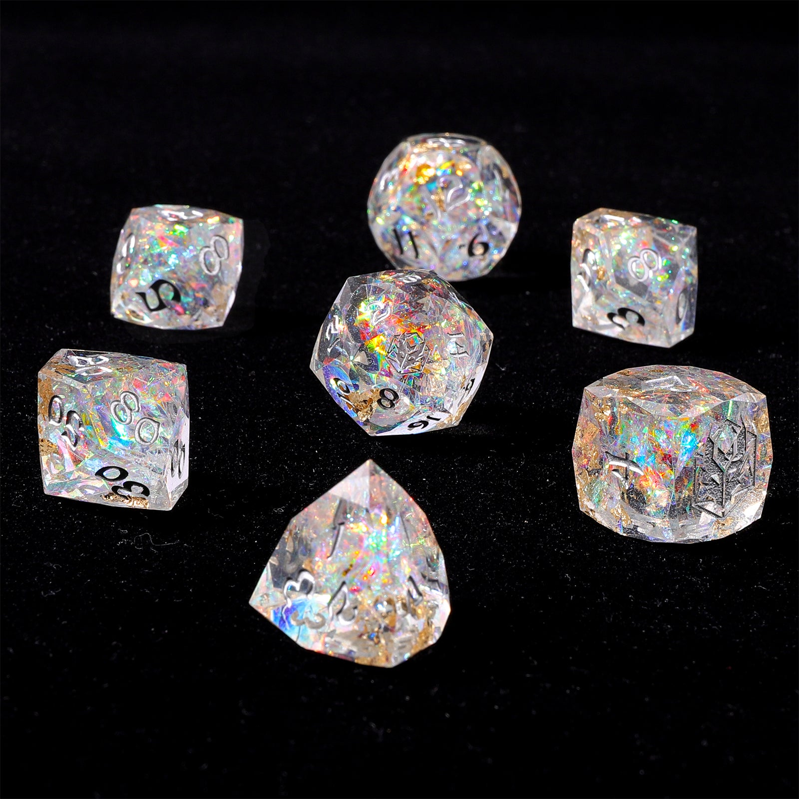 Set of 7 polyhedral resin dice with a luster cut for maximum shine, which shimmers with delicate luster like captured starlight when rolled.