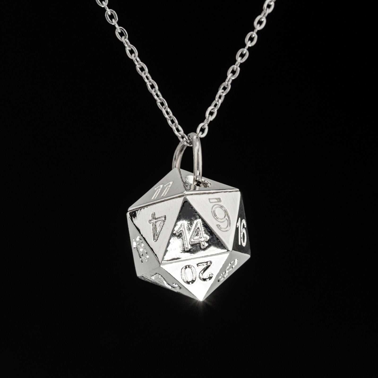 Silver D20 dice necklace pendant with chain for D&D gamer