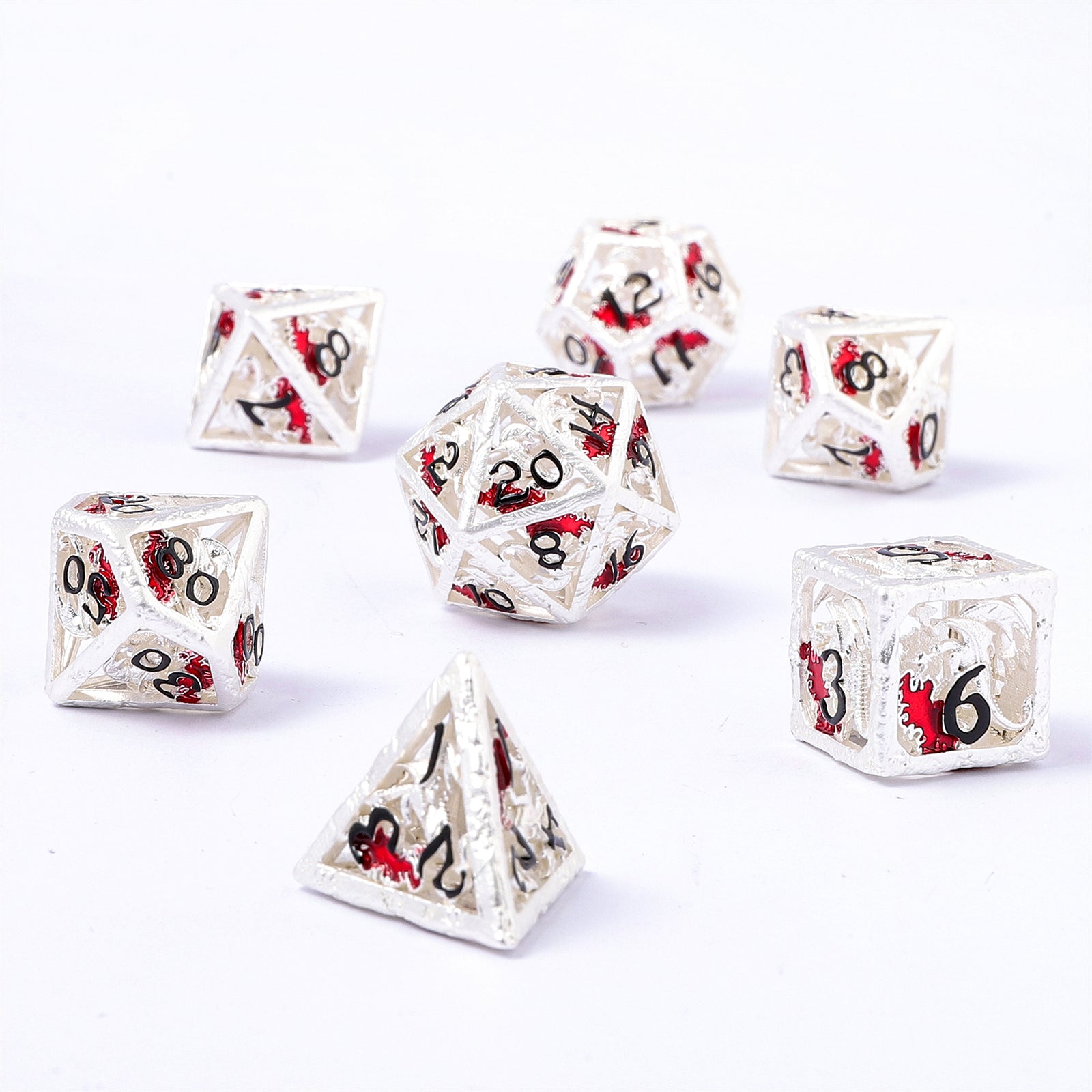 Set of 7 polyhedral hollow metal dice in Dragon's Hymn! All our metal dice sets are cast from zinc alloy metal to assure better balanced rolls. Each set comes with its own metal dice box for easy storage and a winning presentation.